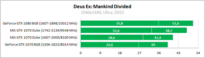 Крепким орешком оказывается Mankind Divided в разрешении 2560x1440 при максимальном качестве графики, хотя с разгоном уже можно играть при относительно комфортных показателях. Разрыв между GeForce GTX 1070 и GeForce GTX 1080 весьма существенный — более 30%. MSI при максимальных частотах удается добиться преимущества более 20% относительно референсного товарища, что, впрочем, на фоне остальных результатов является единственным примером столь серьезного ускорения.