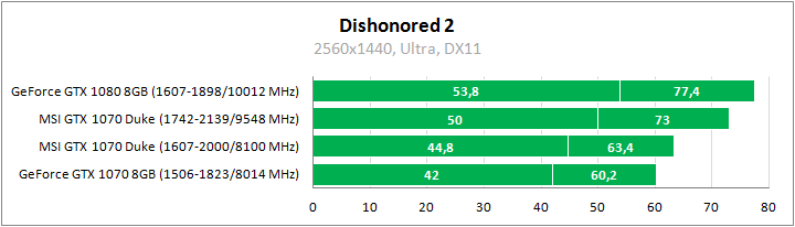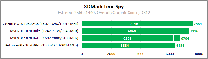 В данном тесте разница между GeForce GTX 1070 и GeForce GTX 1080 более 21%. MSI Duke быстрее референса на 6%, прирост от разгона 10%.