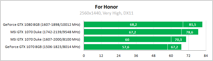 В новом экшене For Honor видеоадаптер GeForce GTX 1070 выдает около 60 fps и более даже в самые тяжелые моменты. Отставание от GeForce GTX 1080 на уровне 18–21%. Разгон MSI обеспечивает ускорение относительно референса до 17%. Тестирование более доступных видеокарт в игре представлено в нашем специальном материале.