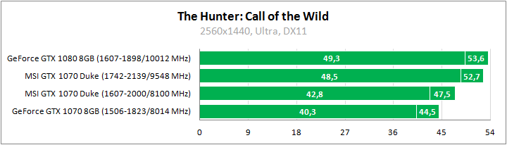 Данная игра про охоту примечательна симпатичной картинкой и серьезными системными требованиями. GeForce GTX 1070 позволяет нормально играть в The Hunter: Call of the Wild, но частота кадров пониже, чем во многих других играх нашего сравнения. Разрыв между GeForce GTX 1070 и GeForce GTX 1080 более 20%, но MSI Duke в разгоне вплотную приближается к конкуренту.