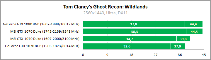 Еще ниже показатели в новом шутере Ghost Recon: Wildlands. Большие открытые просторы с высокой детализацией серьезно нагружают даже видеокарты старшего сегмента. Чтобы достичь среднего результата в 40 fps, для GeForce GTX 1070 нужен разгон. Разница со старшим товарищем около 17%, и MSI Duke на повышенных частотах впервые демонстрирует паритет с GeForce GTX 1080 Founders Edition.