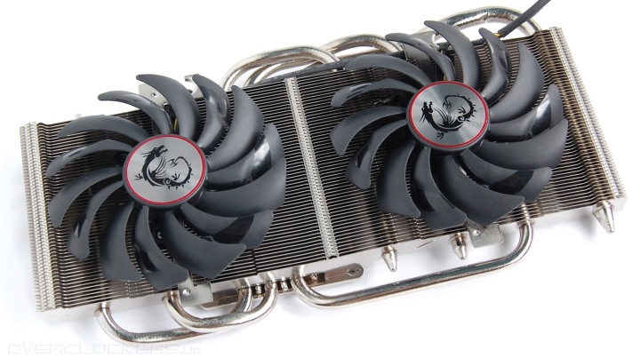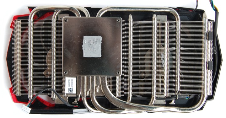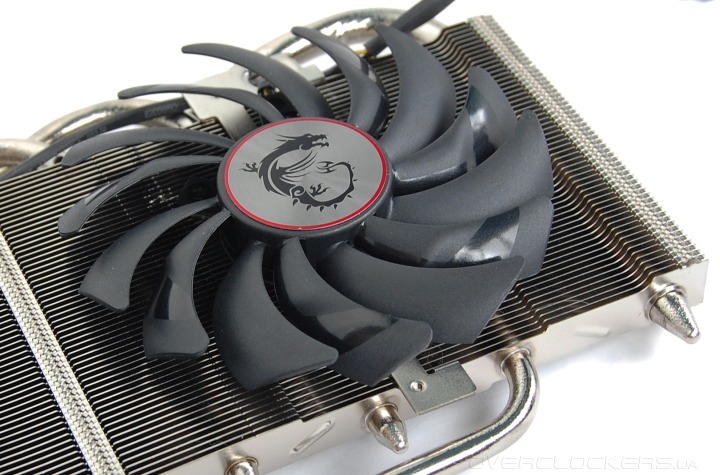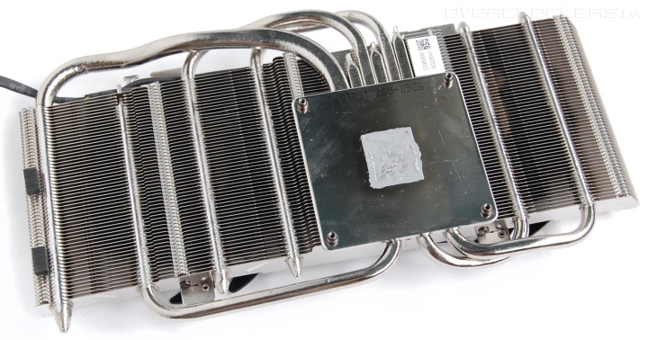 У кулера крупное основание, которое контактирует с поверхностью графического чипа. Использование такой крупной пластины гарантирует надежный контакт со всеми шестью тепловыми трубками, среди которых одна гигантского диаметра 10 мм. Также производитель гарантирует использование высококачественной термопасты.