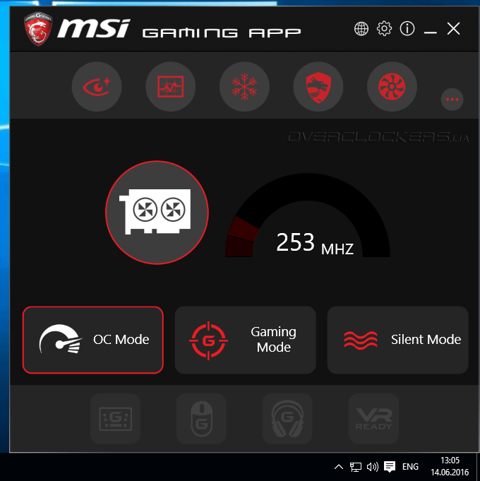 На диске с программным обеспечением поставляется утилита MSI Gaming App, которая позволяет управлять рабочими профилями и другими настройками. Интерфейс программы слегка изменился, она стала крупнее. Основные функции вынесены на большие кнопки, так что все ясно и понятно. По умолчанию MSI GeForce GTX 1080 Gaming X 8G работает в самом производительном режиме OC Mode. При переключении в Gaming Mode частота ядра снижается на 26 МГц, память опускается до стандартного уровня в 10010 МГц. В Silent Mode частота ядра опускается до 1607 МГц, т.е. до уровня референса. Silent-режим обеспечивает минимальный шум при производительности, близкой к стандартному уровню. Но нужно поминать, в тяжелых рабочих режимах референс все равно будет чуть слабее из-за понижения частот в результате превышения температурного лимита. MSI же будет постоянно поддерживать больший Boost благодаря лучшему охлаждению.