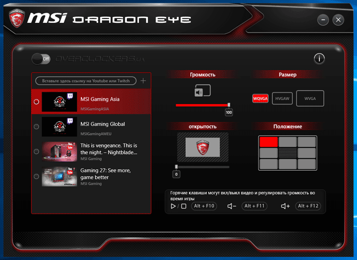 Комплект программного обеспечения MSI пополнился еще одним приложением. MSI Dragon Eye позволяет одновременно играть и смотреть видео с YouTube или Twitch. Утилита выводит видео поверх игры в соответствии с заданными настройками положения этого окна. Можно сразу смотреть какое-то прохождение или руководство по игре, не отвлекаясь от своего игрового процесса.
