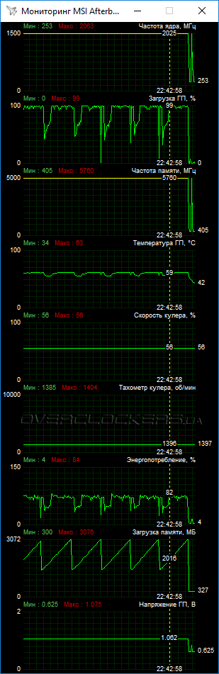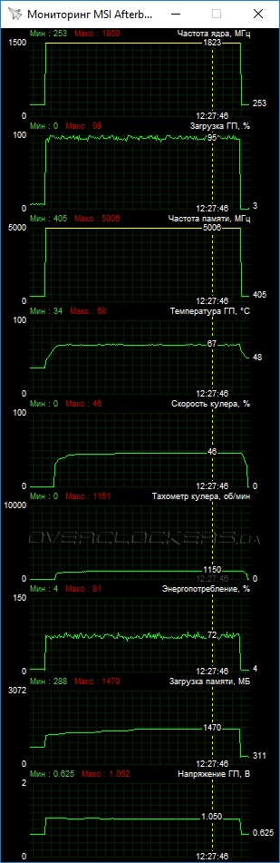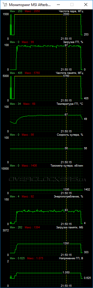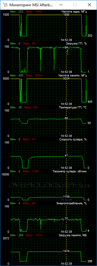К выходу новых GeForce была выпущена специальная версия MSI Afterburner, которая обеспечивает полную функциональность для Gaming X, позволяя не просто менять частоты, но и повышать рабочее напряжение. Последнее, впрочем, слабо повлияло на результаты. Повышение напряжение минимально сказалось на росте частот и стабильности. После экспериментов мы остановились на 1796 МГц по базовой частоте при пиковом Boost до 2063 МГц с повышением напряжения лишь на один шаг. Дальнейший разгон GPU приводил к артефактам или потере стабильности в тяжелых тестах. При этом в Last Light частота Boost была близка к уровню 2000 МГц, в The Division выше на 10–20 МГц. Это чуть ниже разгона протестированного ранее референсного образца. А вот разгон памяти немного выше — до 11520 МГц.