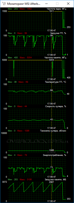 В Founders Edition достижение максимальных частот связано со значительным повышением шума, и такой режим не подходит для повседневного использования. А вот на MSI GeForce GTX 1080 Gaming X разгон реализуем в тихом режиме. Ручная фиксация скорости вентиляторов на скромных 1400 об/мин позволило удержать рабочие температуры на начальном уровне. Великолепный результат!