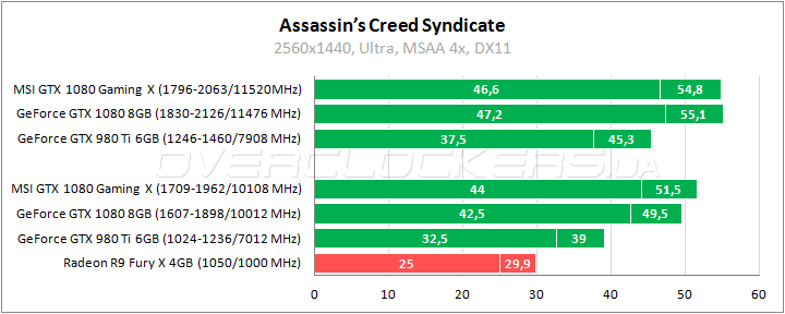 В номинале MSI Gaming X на несколько процентов быстрее обычной версии GeForce GTX 1080. Отставание GeForce GTX 980 Ti и Radeon R9 Fury X от лидеров в Syndicate весьма внушительное. В разгоне оба представителя новой серии демонстрируют минимальную разницу в результатах.