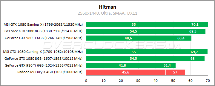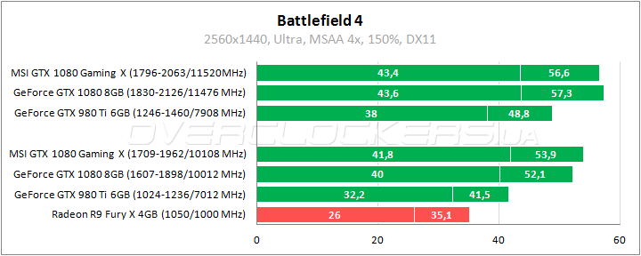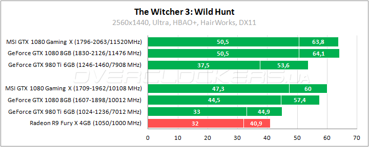 Около 5% выигрывает MSI у простого товарища в The Witcher 3. Отрыв нашего героя от Radeon R9 Fury X около 47%. В разгоне оба видеоадаптера GeForce GTX 1080 максимально близки по результатам.