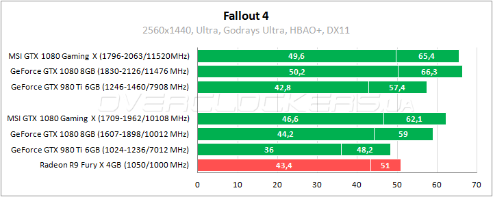 При настройках графики выше Ultra-профиля в Fallout 4 представитель AMD внезапно обгоняет GeForce GTX 980 Ti, что, впрочем, не влияет не лидерские позиции новых видеоадаптеров Pascal. GeForce GTX 1080 быстрее Radeon R9 Fury X на 2–16%, у MSI дополнительное преимущество в 5%.