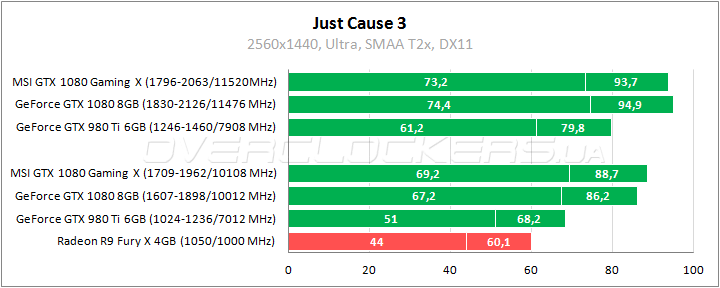 Видеоадаптер MSI выигрывает у референса около 3% в Just Cause 3. Отрыв от Radeon R9 Fury X более 50%. После разгона герой обзора на 1% слабее ускоренного референса.