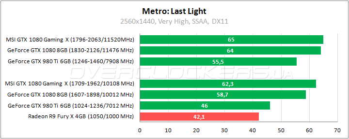 В Last Light разница между MSI GTX 1080 Gaming X 8G и простым референсом до 6%. Наблюдается даже небольшое преимущество над товарищем в разгоне. У остальных соперников значительное отставание. GeForce GTX 980 Ti даже после разгона не дотягивает до уровня новичков в номинале.