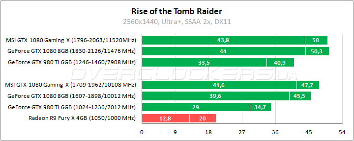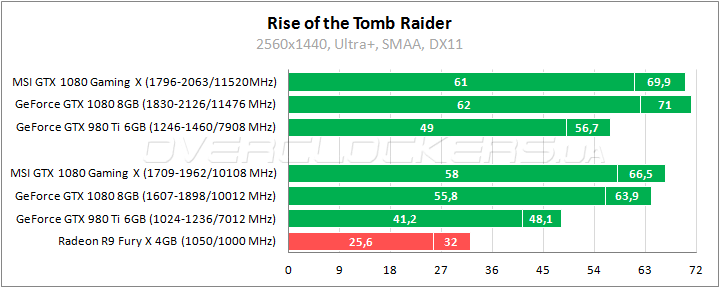 Игра Rise of the Tomb Raider при максимальных настройках графики (выше предустановок очень высокого уровня) загружает около 7 ГБ видеопамяти. И тут находит применение весь объем памяти GeForce GTX 1080. Обычный референс быстрее Radeon R9 Fury X в два раза, а у MSI Gaming дополнительное преимущество в 4%. Разгон ускоряет героя обзора еще на 5%.