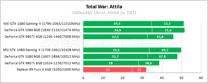 Не более 4% разницы между флагманами тестирования в Attila. Отрыв лидера от GeForce GTX 980 Ti на уровне 20–29%, разница с Radeon R9 Fury X на уровне 34–55%. Разгон обеспечивает скромное ускорение в несколько процентов.