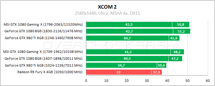 Скромная разница в пару процентов между лидерами в XCOM 2. Отрыв MSI Gaming X от соперника AMD менее 30%, разница с GeForce GTX 980 Ti до 22%.