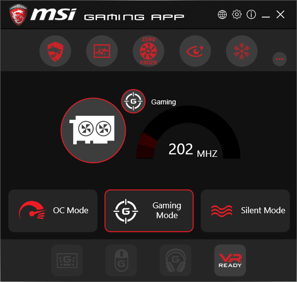 Видеокарта поддерживает несколько рабочих режимов. Начальные установки соответствуют профилю Gaming Mode. Есть еще профиль OC Mode с более высокими частотами ядра 1569/1683 МГц и Silent Mode, в котором частоты снижаются до рекомендованного уровня. Переключение осуществляется через приложение MSI Gaming App.