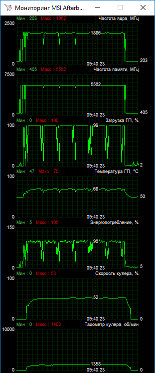 Реализовать разгонный потенциал удалось при умеренном шуме с фиксацией скорости вентиляторов на уровне 1700 об/мин. Более значительно повышение частот приводило к нестабильной работе.