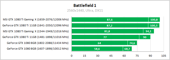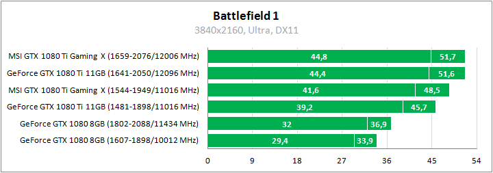 У GeForce GTX 1080 Ti преимущество над GeForce GTX 1080 в Battlefield 1 на уровне 32–34%. MSI Gaming быстрее еще на 6%, прирост от разгона до 7%. В разогнанном состоянии MSI обеспечивает около 50 fps в тяжелой тестовой сцене, но в большинстве игровых ситуаций производительность будет выше.