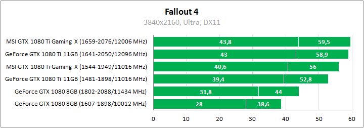 В Fallout 4 видеоадаптеры GeForce GTX 1080 Ti обеспечивают великолепные показатели в формате 2560x1440 и хороший fps в 3840x2160. MSI демонстрирует небольшое превосходство над референсным товарищем в номинале и в разгоне.