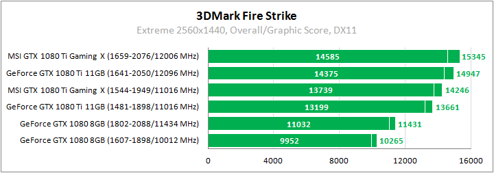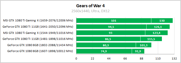 MSI на 5% быстрее обычного GeForce GTX 1080 Ti и на 26% быстрее GeForce GTX 1080 в разгоне. Gaming от повышения своих частот получает ускорение в 7%.