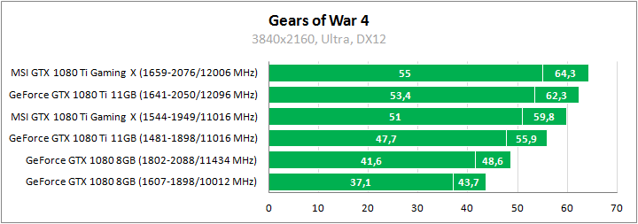 В Gears of War 4 наблюдается серьезное преимущество MSI Gaming относительно референса, что может быть связано с более новым видеодрайвером. И после разгона разница между двумя вариантами GeForce GTX 1080 Ti заметнее, чем в других приложениях. Рассматриваемый видеоадаптер изначально показывает около 60 fps в режиме 4K, а разгон только улучшает показатели.
