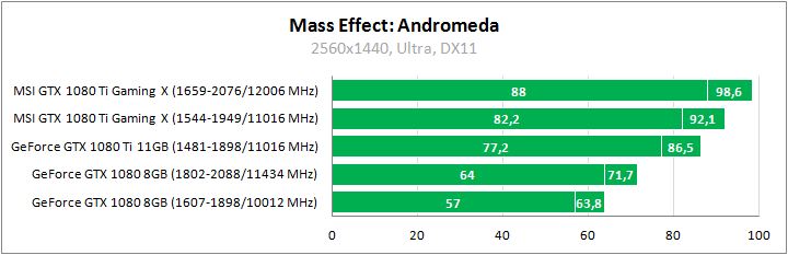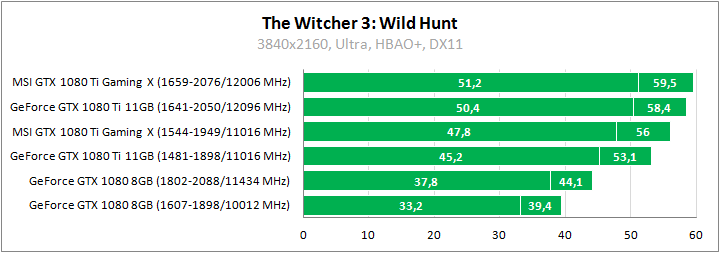 в Witcher 3 пользователи GeForce GTX 1080 могут рассчитывать на разрешение 2560x1440, а Ti-версия вновь позволяет играть в 4K. Разница между ними около 30% в меньшем разрешении и 35% в максимальном. MSI быстрее референсного товарища на 6%, разгон обеспечивает ускорение в 6–7%.