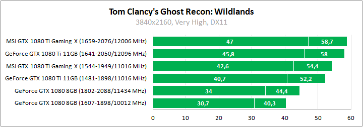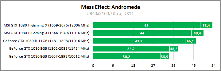 Разница в производительности между GeForce GTX 1080 Ti и GeForce GTX 1080 на уровне 35% в более низком разрешении и 36% в максимальном разрешении. И если младший видеоадаптер позволяет играть только в 2560x1440, то старшему по плечу режим 4K при частоте кадров 46–53 fps.