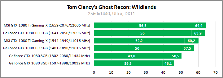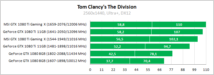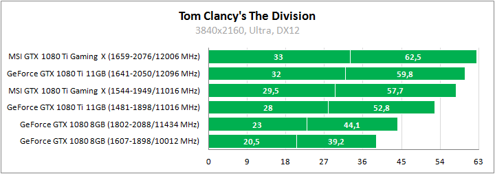 В The Division мы снова видим хороший отрыв MSI Gaming от референсного товарища. Причина такого ускорение не только в более высоких частотах, мог помочь и новый драйвер у MSI. В итоге при сравнении разогнанных GeForce GTX 1080 Ti разница 3-5% в пользу Gaming.
