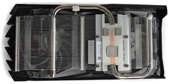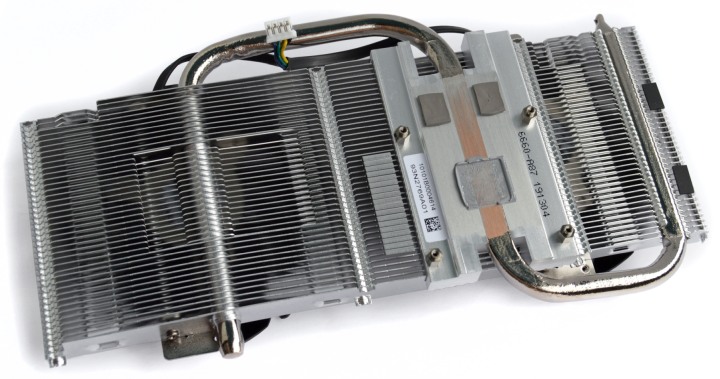 Реализован прямой контакт тепловой трубки с поверхностью графического чипа. По отпечатку термопасты видно, что трубка накрывает половину площади кристалла. Тщательная подгонка трубки к каналу и шлифовка основания минимизируют возможные зазоры по краям трубки. Также радиатор отводит тепло от микросхем памяти. Для этого есть две термопрокладки по бокам от трубки, и еще две прокладки упираются в специальную площадку на ребрах (на фото слева от основания).