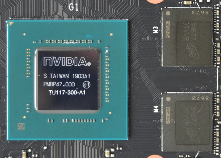 Полная маркировка процессора TU117-300-A1. Вокруг него распаяно четыре микросхемы памяти Micron 8NB77 D9VVR, такие же чипы используются в MSI Ventus. Общий объем памяти равен 4 ГБ.