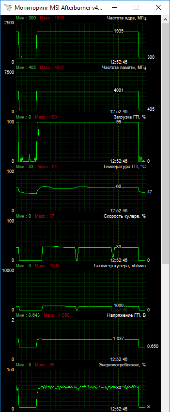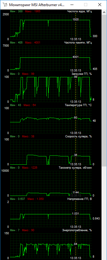 При фиксации вентиляторов на 1300 об/мин температура ядра держалась в рамках 61 °С (открытый стенд, в помещении 22 °С). То есть удалось не только ускорить видеокарту, но и сохранить тихий рабочий режим.