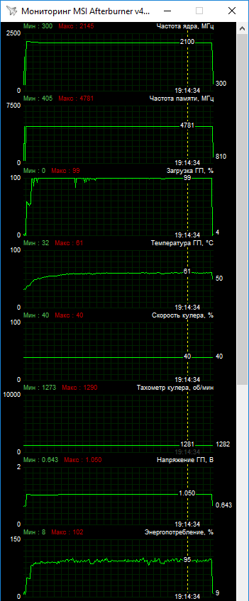 На приведенных выше скриншотах видно, что видеоадаптер достигает 92% от максимальной мощности. То есть у Gaming есть некоторый запас по мощности. И лимит мощности не заблокирован, его можно дополнительно повысить на несколько процентов. Это большой плюс, ведь жесткие ограничения по мощности сдерживают потенциал для дополнительного разгона у простых GeForce GTX 1650. И в плане этого самого потенциала у Gaming все отлично. Данный экземпляр удалось ускорить на 160 МГц по ядру с пиковым Boost до 2145 МГц. Средние частоты в нагрузке почти всегда стабильно держались на отметке в 2100 МГц. Память стабильно работала на частотах 9562 МГц — внушительный результат для чипов GDDR5, но Ventus по памяти показывал такие же результаты.