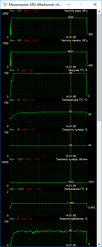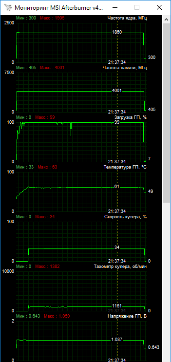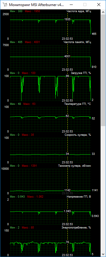 В игровом режиме Boost держался на уровне 2055–2070 МГц при пиковом значении 2100 МГц. В тяжелых играх (Final Fantasy XV) это были стабильные 2055 МГц без колебаний.