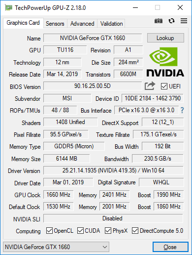 NVIDIA не представила эталонные версии GeForce GTX 1660, поэтому производители сразу выпустили на рынок множество вариаций с разным охлаждением и повышенными частотами. В наши руки попала топовая видеокарта MSI Gaming, но мы попутно протестируем ее и на рекомендованных частотах, чтобы получить полное представление о разных моделях серии GeForce GTX 1660.