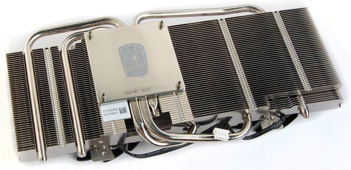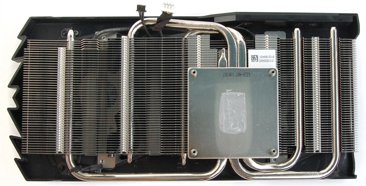 Тепло отводится от кристалла GPU через большое ровное основание. Задействовано три тепловые трубки, которые равномерно пронизывают массив тонких пластин. Очень напоминает охлаждение MSI GeForce GTX 1060 Gaming.