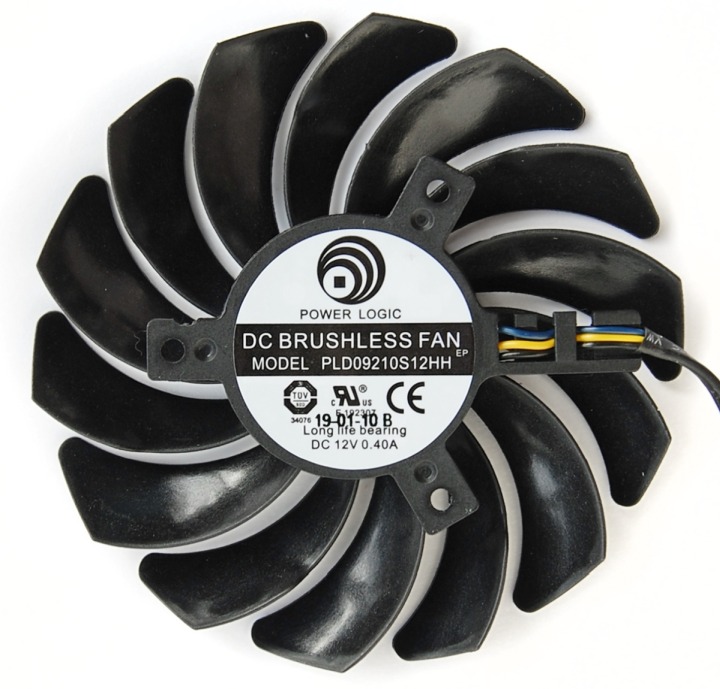 Используются вентиляторы Power Logic PLD09210S12HH. Их диаметр 90 мм (крыльчатка примерно 87 мм). И это немного неожиданно, ведь даже в GeForce GTX 1060 Gaming были вентиляторы типоразмера 100 мм.