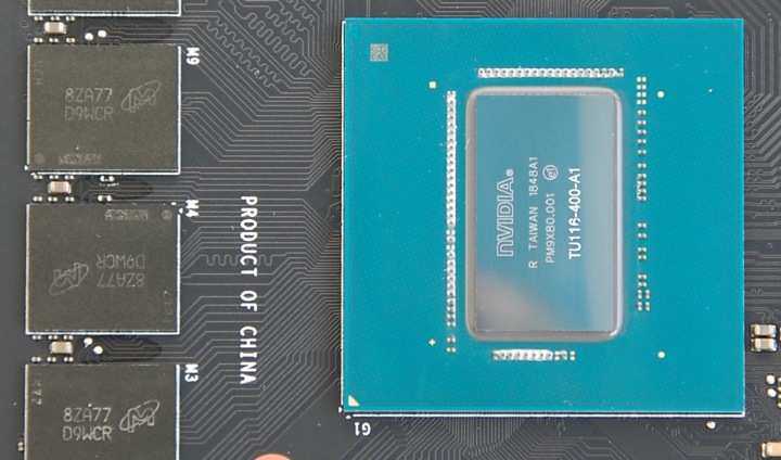 Полная маркировка процессора TU116-400-A1. Шесть гигабайт памяти набрано микросхемами Micron 8ZA77 D9WCR.