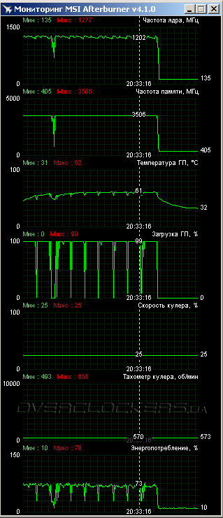 Ниже приведены скриншоты мониторинга параметров при нагрузке в Metro Last Light (пять повторов бенчмарка) и Thief (семь прогонов теста). На последнем зафиксирован редкий момент с частотой 1254 МГц. Но в реальности частоту 1267 МГц можно считать абсолютно стабильной.