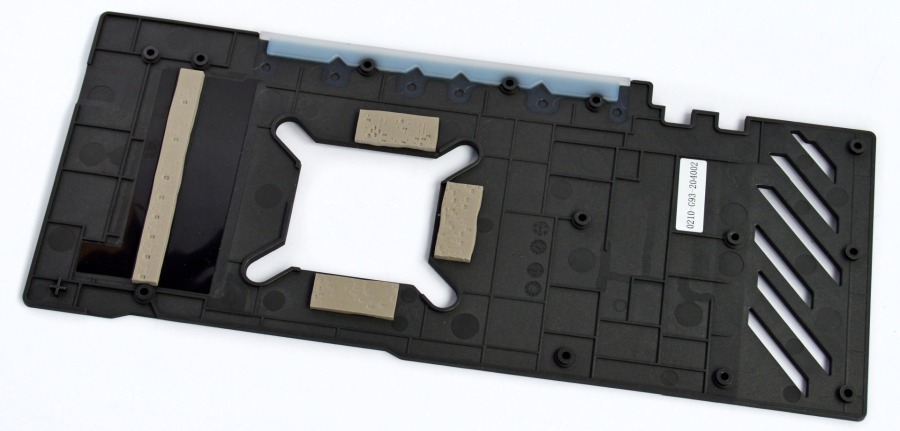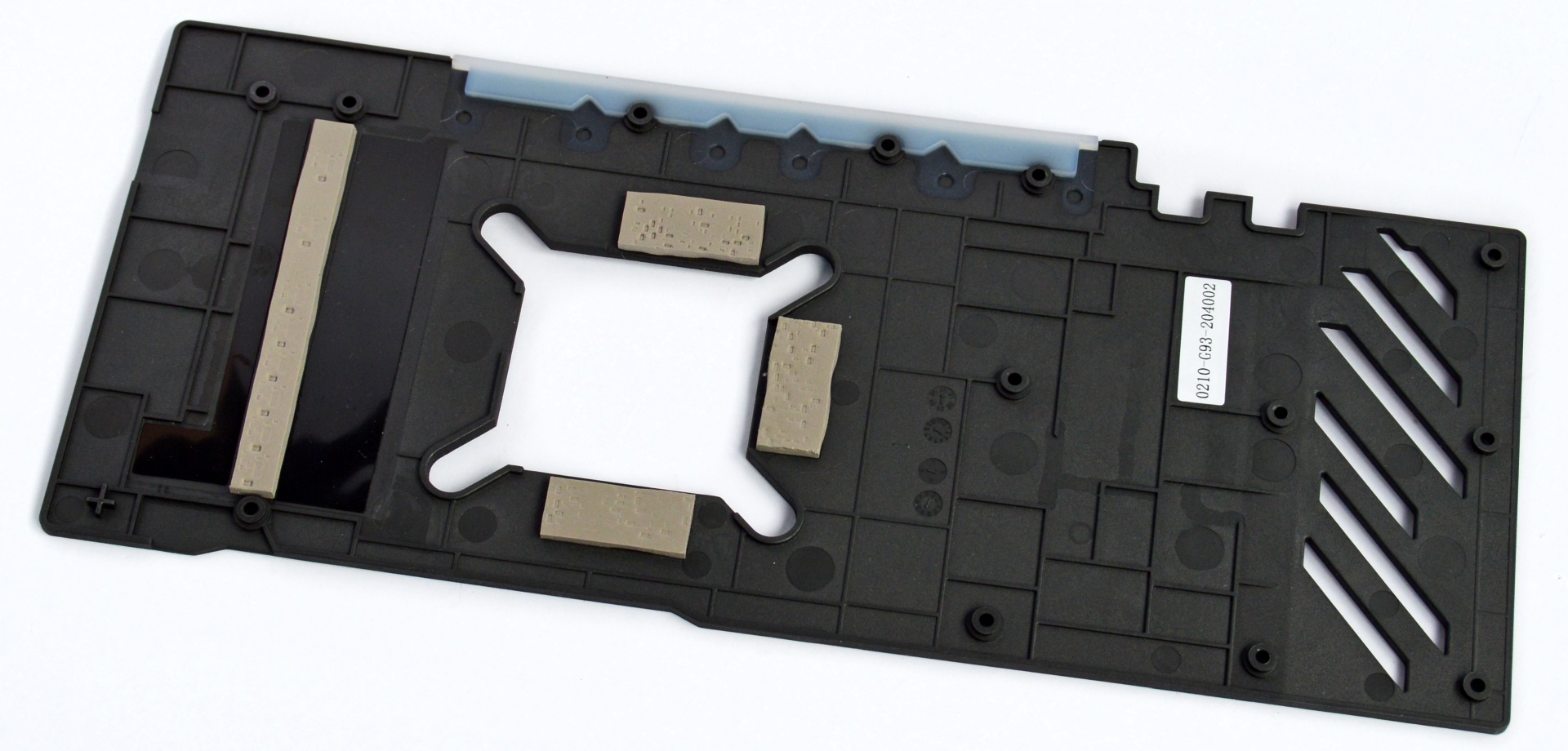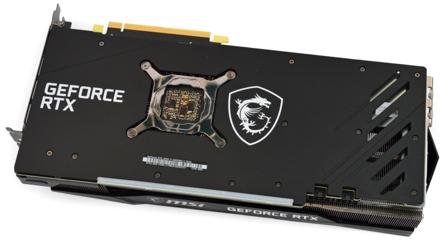 Бэкплейт выполнен из материала с использованием графена (если верить производителю). Он охлаждает PCB благодаря наличию термопрокладок для контакта с горячими зонами платы (под элементами системы питания и микросхемами памяти). Об эффективности такого «графенового радиатора» говорит факт применения аналогичной пластины в MSI GeForce RTX 3080 Gaming X Trio.