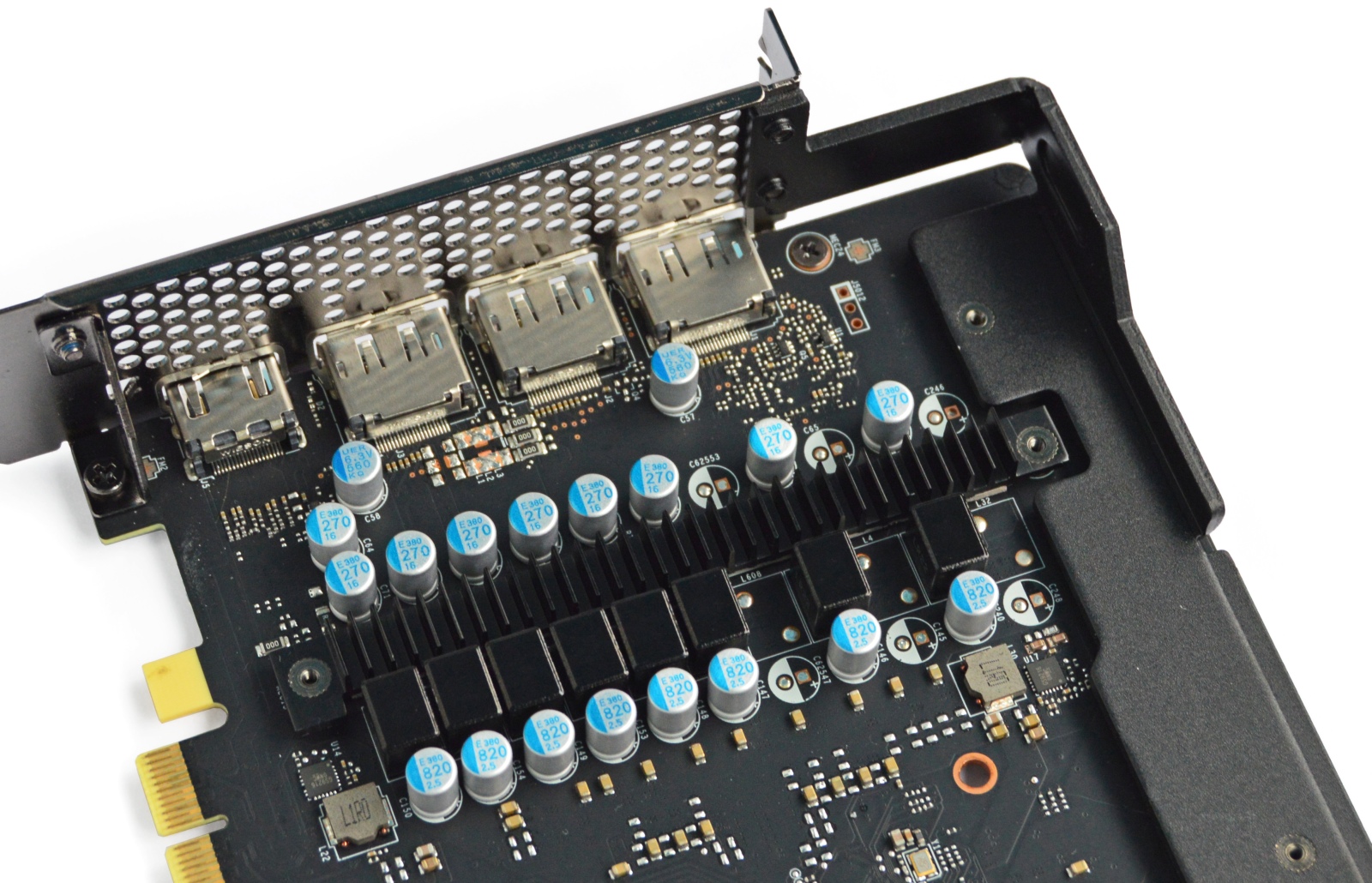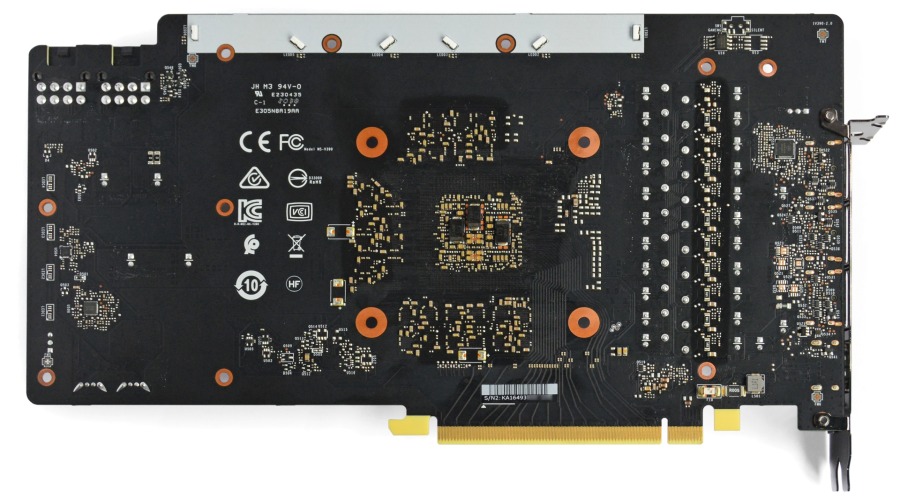 Обратная сторона видеокарты закрыта черной пластиной. Сбоку есть прорези для уменьшения сопротивления воздушным потокам внутри корпуса.