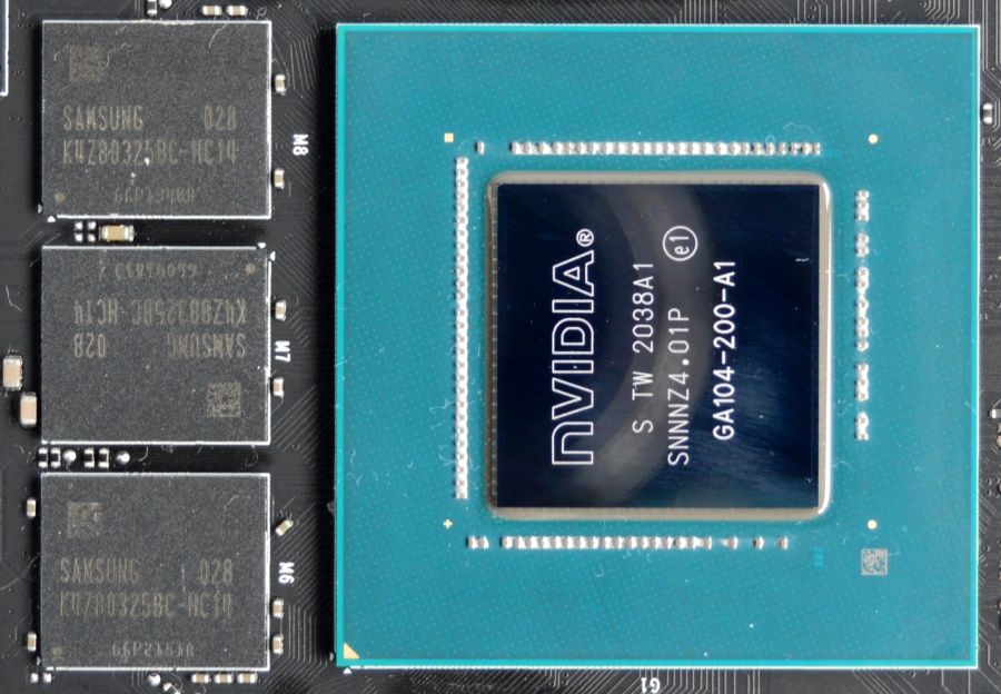 Процессор GA104-200-A1 задействует 4864 потоковых процессоров при 152 текстурных блоках и 80 блоках растеризации. Распаяно 8 гигабайт памяти GDDR6 Samsung K4Z80325BC-HC14.