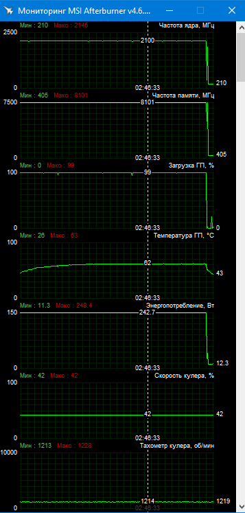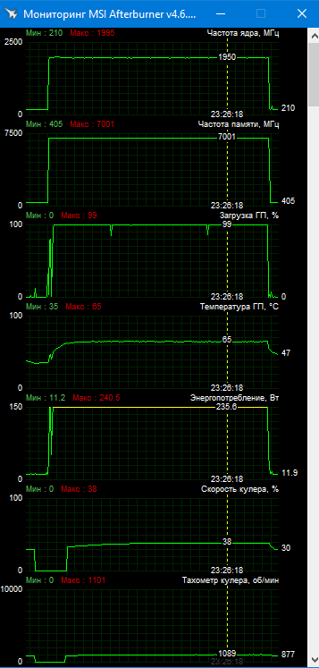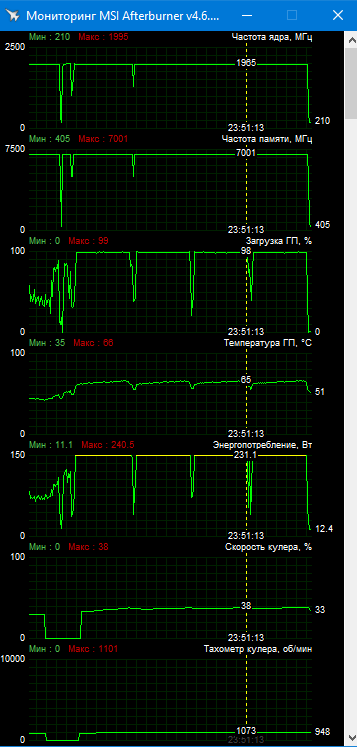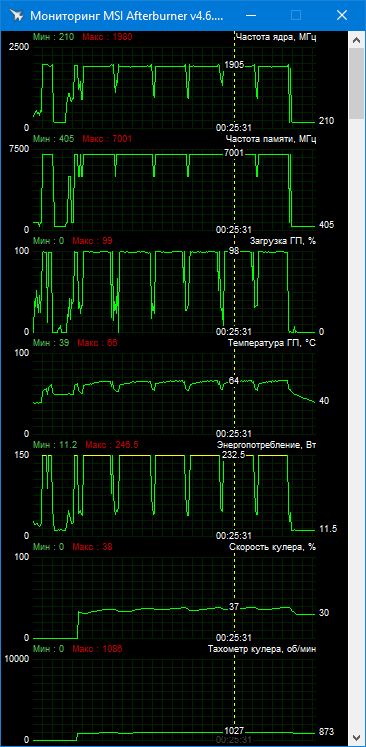 Тестирование проводилось в открытом корпусе при 23 °C в помещении. В таких условиях температура GPU не превышала 65 °C, вентиляторы работали на скорости менее 1100 об/мин. В большинстве игр Boost держался на уровне 1950–1965 МГц с пиковыми значениями до 2010 МГц. Это проиллюстрировано ниже на скриншотах мониторинга во время прохождения тестов Bright Memory: Infinite RTX и Horizon Zero Dawn в 4K.