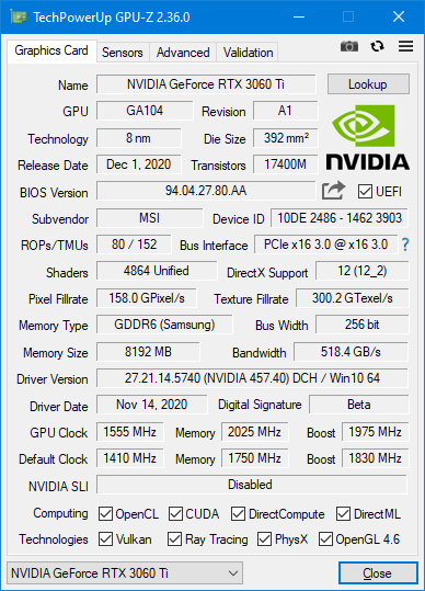 - драйвер: NVIDIA GeForce 457.40/456.96.