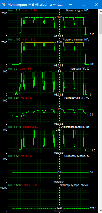 В играх такой разгон обеспечил Boost около 2100 МГц при пиковых значениях до 2145 МГц. Даже в The Division 2 частоты не опускались ниже 2055 МГц. Память смогла стабильно работать на частотах до 16200 МГц.