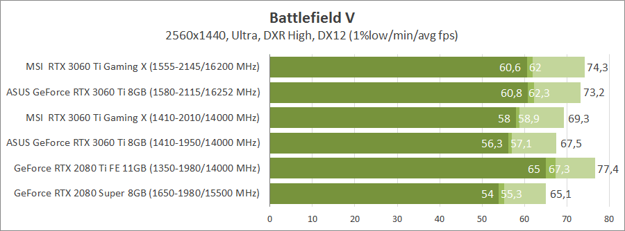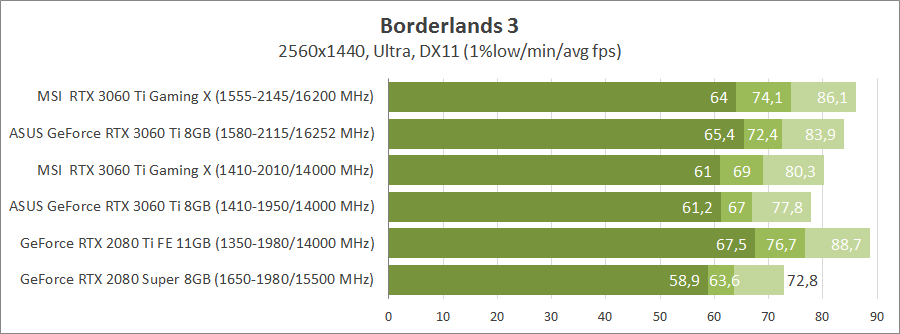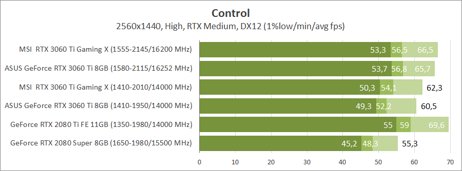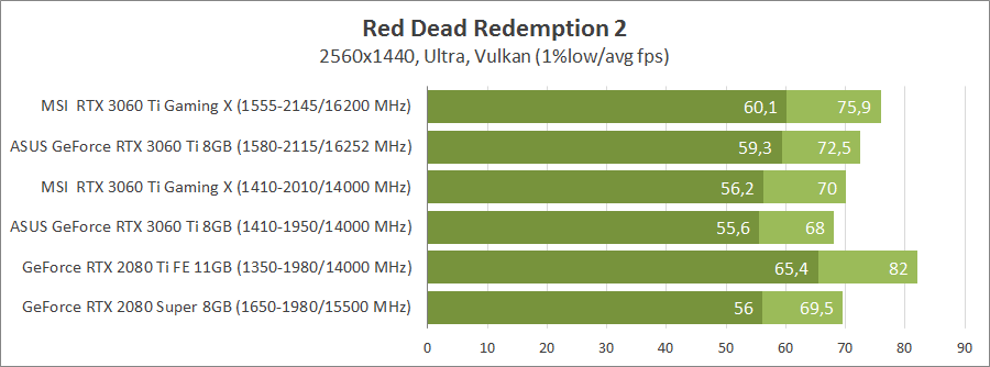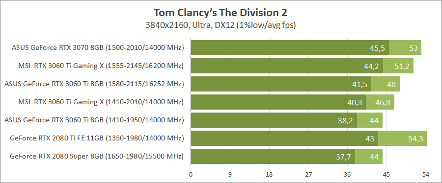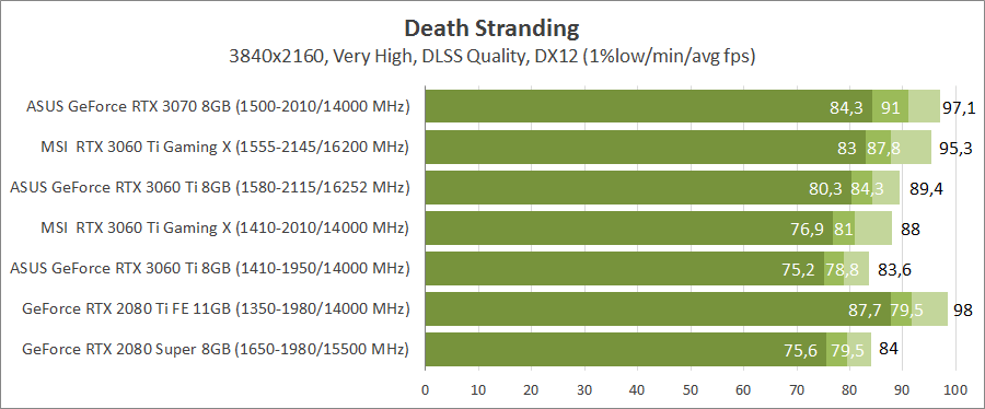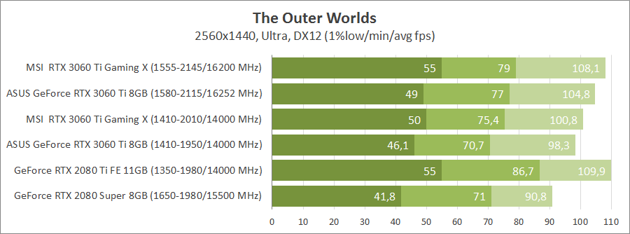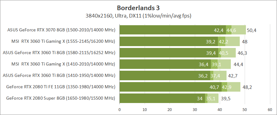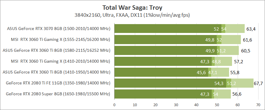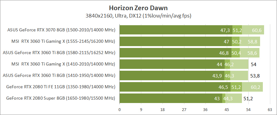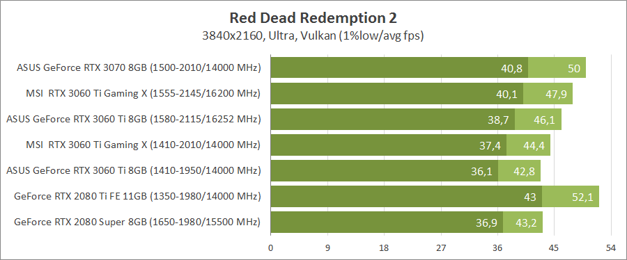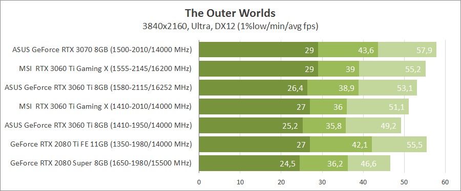 MSI RTX 3060 Ti выиграет заметно превосходит решение ASUS в данной игре. Разгон привычно минимизирует отставание от GeForce RTX 3070.