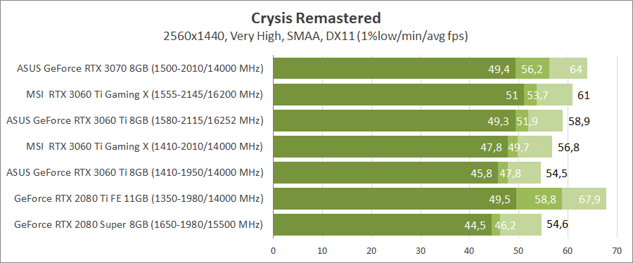 В обновленном Crysis наблюдается стандартное преимущество MSI над ASUS. В разгоне герой обзора наступает на пятки GeForce RTX 3070.