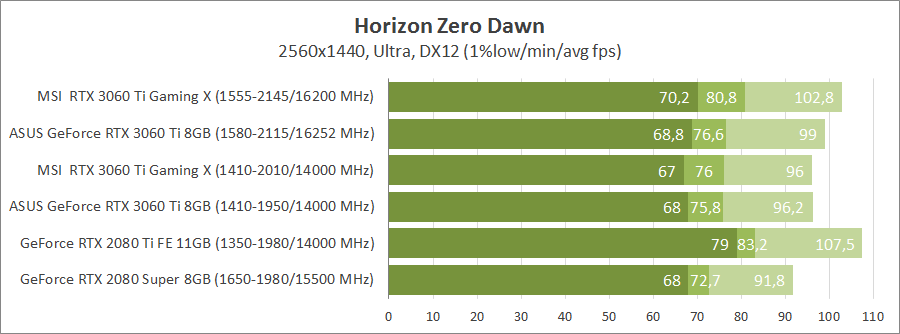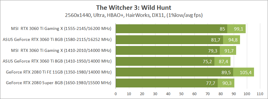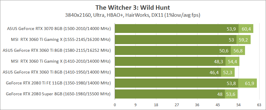 ASUS GeForce RTX 3060 Ti в «Ведьмаке» немного уступает GeForce RTX 2080 Super, а MSI GeForce RTX 3060 Ti c более высокими заводскими частотами уже быстрее. Разгон обеспечивает дополнительное ускорение 8–10%.