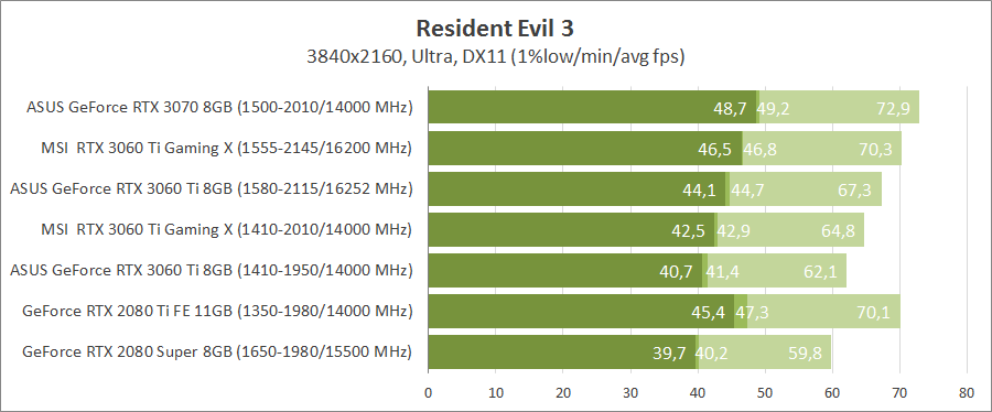 Привычная расстановка сил в Resident Evil 3. В номинале MSI быстрее ASUS, а при максимальных частотах показывает производительность уровня GeForce RTX 2080 Ti.