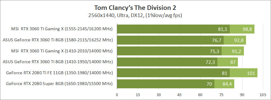Наиболее сильно частоту GPU просаживала игра Tom Clancy’s The Division 2, вплоть до 1905 МГц.