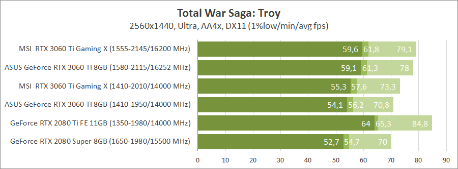 Одна из игр, где GeForce RTX 3060 Ti показывает результаты не выше GeForce RTX 2080 Super, но благодаря высокому частотному потенциалу MSI в итоге уходит в серьезный отрыв.