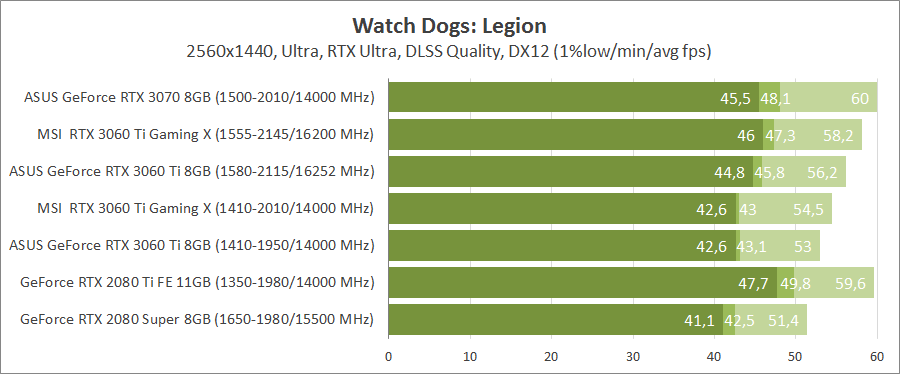 Последняя игра серии Watch Dogs чрезвычайно требовательна. GeForce RTX 3060 Ti хорошо справляется с Ultra-эффектами RTX в формате 2560x1440 при активной технологии DLSS. Разгон позволяет минимизировать отставание от GeForce RTX 3070 и GeForce RTX 2080 Ti.